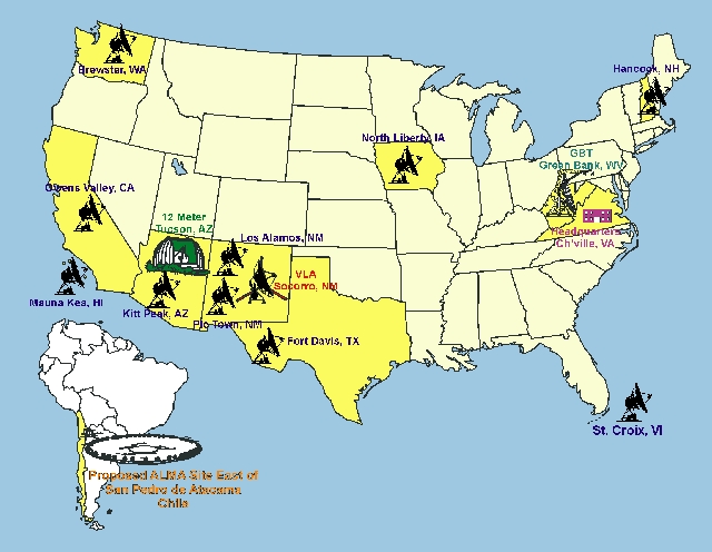 Established in the waning years of the 1950s, the National Radio Astronomy Observatory is a facility that now comprises telescopes at several widely scattered sites across the United States. Headquartered in Charlottesville, the main instruments it operates are the Very Large Array (VLA), located 50 miles west of Socorro, New Mexico; the Green Bank Telescope (GBT, due to be commissioned in August 2000) in West Virginia, and the Very Long Baseline Array (VLBA) which has ten large telescopes in locations ranging from Hawaii to New Hampshire, and Washington State to the U.S. Virgin Islands. Visitor centers are located in Green Bank and at the VLA. Anyone who has seen either the movie Contact or 2010 has seen the VLA; both those movies were shot partially on location out on the dusty plains of San Augustin at the VLA site. And no, there isn't a canyon next to the VLA; that was artistic license on the part of the Contact directors! The canyon is actually Canyon de Chelly in neighboring Arizona.