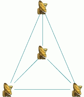 Without going into excessive technical detail, here's how aperture synthesis works. Several radio telescopes (antennae) are used, and the signals from each of them are captured, sent via wire or microwave “waveguide”, digitized and fed into a special-purpose computer known as the “correlator”. This one-of-a-kind computer takes the signals from each antenna and correlates them with all other signals. The result is a series of signals called “baselines”, as they represent the correlation of the signal from the ends of a baseline joining the two antennae. For a set of n antennae, you get nx(n-1)/2 baselines. If n is 4, for example, you get (4x3)/2 or 6 baselines (see Figure 3). You don't correlate an antenna with itself, and you don't count antenna.1-antenna.2 and antenna.2-antenna.1 baselines as separate.