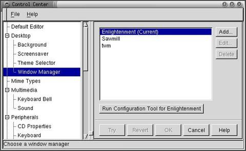 My reading on the mailing lists indicates that esd is the best working sound server for PPC, so I launch “switchdesk”, change my desktop environment to GNOME and restart X. GNOME now comes configured to use sawmill, rather than Enlightenment, but there is an option in the GNOME Toolbox to change to Enlightenment. (Watch it here, because it says Enlightenment is the current window manager. I actually had to select sawmill, save the changes, then select Enlightenment to make it take. See Figure 5.) I do this, enable system sounds and set up my preferred desktop theme, colors, etc., then shut down and restart X. I've got system sounds and am greeted by a female voice welcoming me to Enlightenment (see Figure 6). I pop in my favorite David Torn CD and run the GNOME CD player applet, and I'm one happy camper. One annoyance is that restarting X seems to place the blue desktop background over my chosen pattern until I reset it. I found I had to go into GNOME's settings rather than Enlightenment's to turn the blue background off.