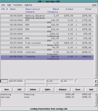 cbb allows you to import QIF files, so that you are able to use your existing data. Unfortunately, the import function did not work correctly on the QIF file I created in Quicken 99. While I did get transactions, there were no dates for them, and I could not edit them after I imported them. There were also some lines at the beginning of my ledger that contained data cbb apparently could not decode from the QIF file.