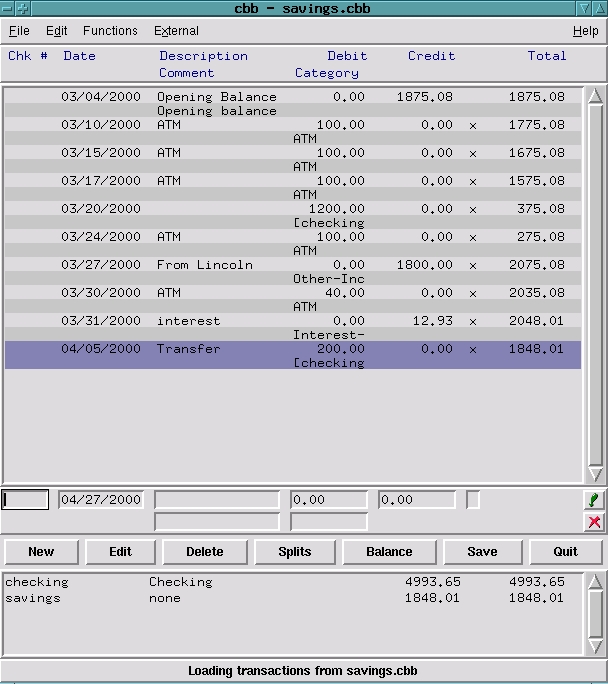 cbb keeps account information in individual files, one .cbb file for each account. A list of accounts and their current balances is displayed at the bottom of the screen, and the account's entries are shown when you select it (see Figure 1).