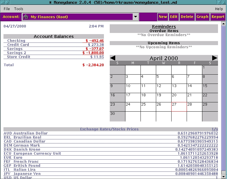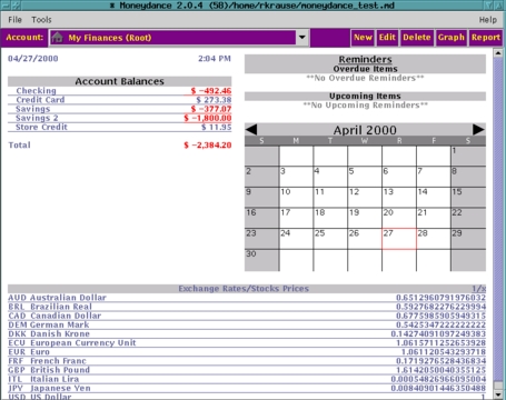 GnuCash is the most ambitious financial program being developed at this time. It offers the greatest variety of account types, sub-accounts and stock price retrieval. This program was the most difficult to compile and get working because it depends on quite a few other programs, libraries and Perl modules. I looked at both the stable version (1.2.5) and the current development version (1.3.6).
