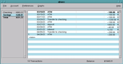 QHacc provides a simple two-paned layout. The left pane contains a list of accounts and balances, and the right pane contains the ledger for the selected account (see Figure 3).