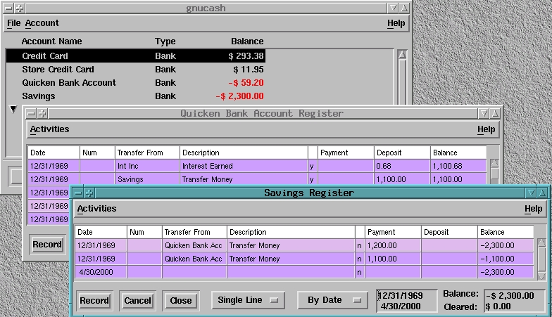 I had some problems importing my QIF file from Quicken 99. GnuCash version 1.2.5 read my Quicken file and did a good job of creating my chart of accounts, but all the ledger entries from the QIF file had a date of 12/31/1969. Version 1.3.6 could not even read my QIF file, quitting with the message “wrong argument in position 1”.