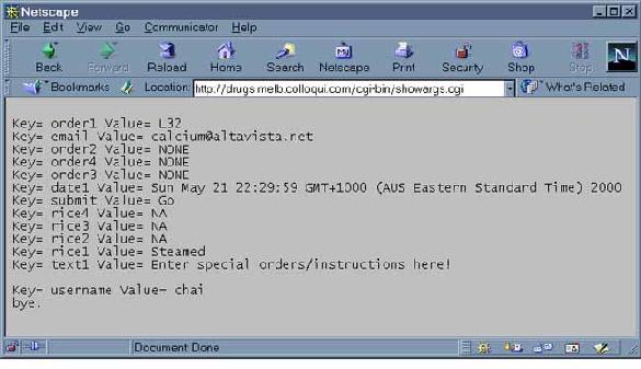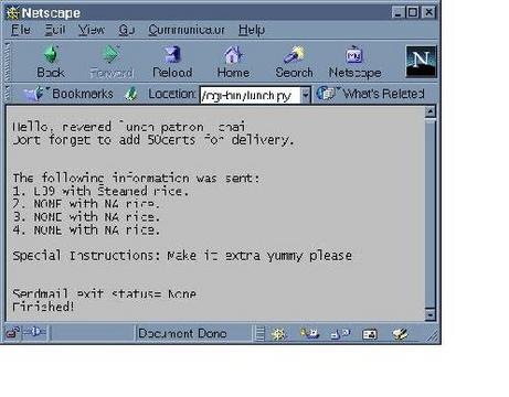 I opened Netscape, typed in https://localhost/lunch.html as the URL, filled in the form, selected my order and clicked on “Go”.