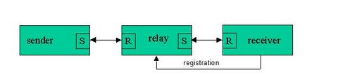 The advantages of this construct over a basic sender/receiver pairing lie in the name hiding that can occur with the receiver. It is also possible to start and stop receivers dynamically in this scheme without having to recommunicate naming information to the various senders in the system. If that occurs the startup message exchange, called registration in the diagram above, takes care of notifying the relay task of the new receiver's name information.