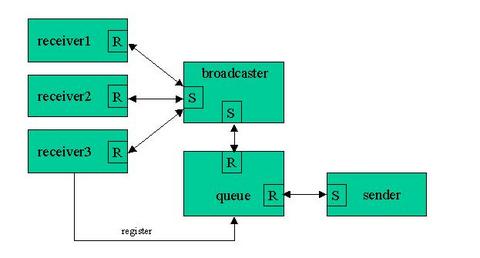A typical sequence may start with a receiver (say receiver1) deciding that it wishes to receive broadcast messages. As part of that sequence it sends a registration-type message to the broadcaster's queue process. The queue will then place a REGISTRATION-type message onto its internal queue. Meanwhile the broadcaster returns from one of its broadcast sequences by sending a message down to the queue process asking whether there are any new messages queued. In this example the REGISTRATION message for receiver1 is delivered as a reply to the broadcaster. When the broadcaster process detects that the message is a new REGISTRATION, it does a nameLocate on that the recipient (receiver1 in this example) and stores the ID in its internal broadcast list. It sends a confirmation message back to the queue process, which then proceeds to reply and unblock the original receiver (receiver1—who was temporarily a sender). If there were no more messages on the internal queue, the broadcaster would simply be left reply blocked at this stage. At this point the sender may send a message to the broadcaster's queue process that is intended for broadcast. Typically the queue would queue the message and reply immediately to the sender, but one could do a blocking send scheme similar to that of the registration process. If the queue detects that the broadcaster is reply blocked it immediately forwards the message via a reply to the broadcaster. Once the broadcaster gets the message it notes that this is not a registration and therefore is a message to be sent to all the registered recipients in its broadcast list. Once this series of sends is complete the broadcaster will send back to the queue for the next message and the process repeats.