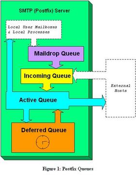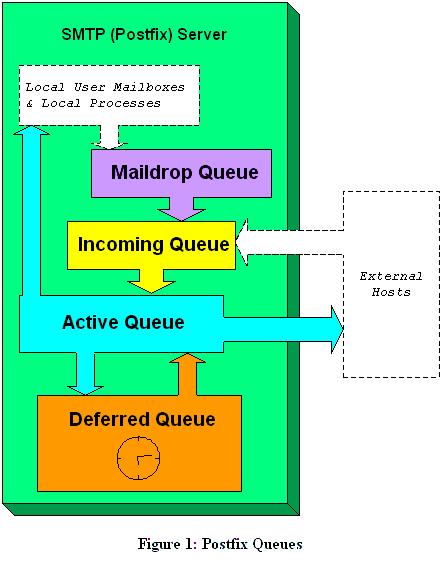 A key contributor to the stability and the speed of postfix is the intelligent way in which it queues mail. Postfix uses four different queues, each one of which is handled differently (see Figure 1):