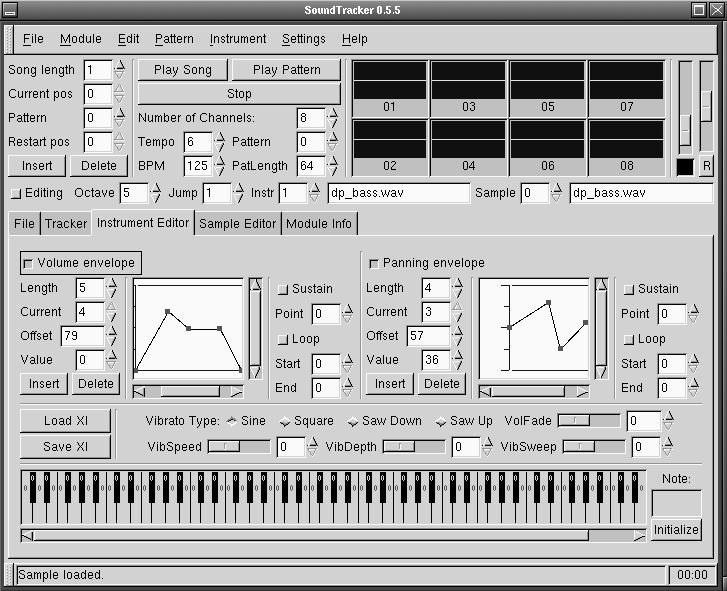 All sounds used in mods are sampled sounds, so you'll want to build a collection of samples that meets your compositional needs. You can rip samples from existing modules, or you can gather sounds from the various sample collection sites listed on the United Trackers and MODPlug Central web pages. SoundTracker can load any audio file type supported by libaudiofile, so you can freely mix WAV, AIFF and AU files in the same module.