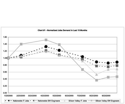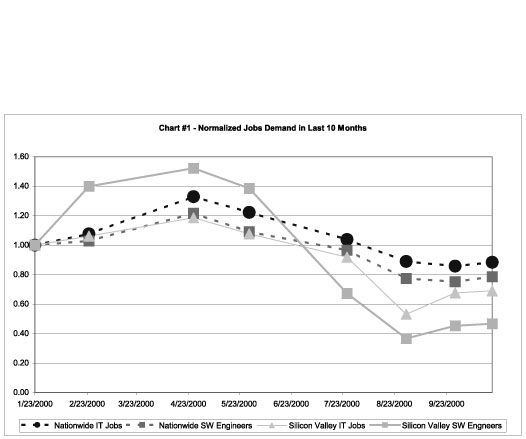 Last month, there was a slight up-tick in the number of software engineering jobs in demand, particularly here in the Valley. This month proves that it was no fluke. There is still a continuing demand for both IT skills in general and software engineering in particular. However, it does look like it is leveling off. The demand now for software engineers appears to be increasing at the same rate as for all IT positions. (Note: Chart #1 is normalized for the number of jobs in January of this year. That is, the number of openings in January 2000 has been taken as 1.00.)