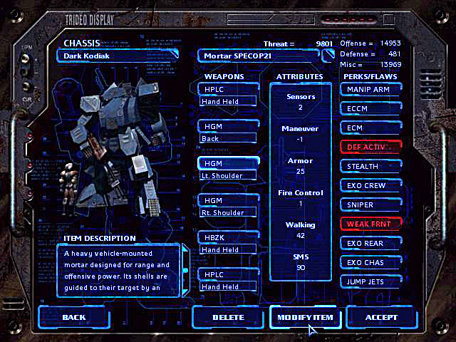 The amount of customization possible in the game is unparalleled. Since you're fighting for two wealthy governments, your budget isn't really limited; you can have anything you want and as much of it as you can carry. The list of possible Gear models is seemingly unending (by my count about 70 primary models) and divided into four main categories: Light, Medium, Heavy (of course) and Assault. There are typically several base configurations for each primary model, and the Gear lab has the functionality to create and save your own custom configurations as often as you like. As for guns 'n ammo to attach to your Gear, again, the list is truly huge; just the names of weapons in the vast array at your disposal take a few minutes to read and a detailed study to understand fully. To create some modicum of balance in the game, a system of “threat levels” has been implemented. Missions have a maximum total threat level that the entire team can have, as well as the maximum total threat level for any single Gear in the team, and you are forced to configure the weapons and equipment of each Gear on the mission so that neither of these limits are exceeded. Added to the mix is a complex system of “Perks” and “Flaws” that can be assigned to alter the threat profile of each Gear (Perks increase the threat score, Flaws decrease it) and make it truly unique on the battlefield. If you're into this sort of highly detailed customization, you won't be disappointed.
