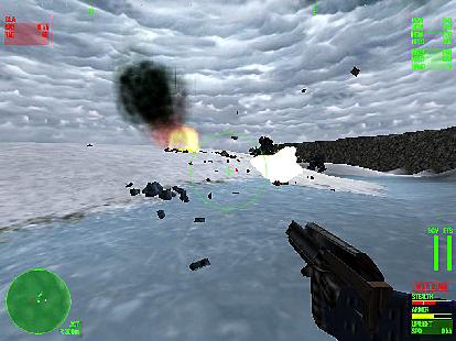 Heavy Gear II isn't simple. This isn't something you can install from your CD and immediately jump into action. HG2 seems nearly flight simulator-like in complexity when one first sits down to it. In fact, to become thoroughly acquainted with all the controls and modes of game play requires a full seven-course meal of rather involved training missions and should probably include the convenient placement of the included keyboard-shortcut command placard just to keep track of the myriad commands used in the game. The payoff, however, is extraordinary; the level of control a player has in HG2 is amazing. For instance, even general movement consists of several axes of control, as one must coordinate the separate movements of the upper torso of your Gear to work in concert with the lower portion of your body. In turn, your lower body has several modes of operation, including jump jets, walking, kneeling, crawling and even, in Gearspeak, an SDS or “Secondary Movement System”, which deploys what amount to all-terrain rollerblades from the soles of your Gear's feet to allow you to, quite literally, skate into battle (or away from it) at high speed. Radar modes allow one to scan actively for nearby enemies, increasing the likelihood that they will be able to detect your Gear's presence. Or, you can enhance your Gear's stealth by switching to a passive-only mode. Your Gear is equipped with maneuvering thrusters for control in the weightlessness of space, and the act of accurately space-maneuvering a Gear in all its possible axes of motion while in a combat situation seems as difficult as neurosurgery the first few times at bat.