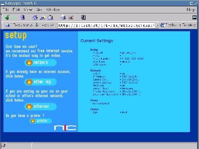 When you first start the NIC, the system will boot Linux, load X11 and bring up a desktop running Netscape with a configuration screen, as shown in Figure 1.