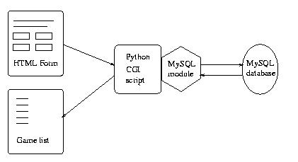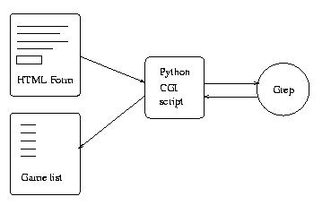 In order to make a better search engine, I had to use a different approach. First, the database should describe the collection of game files. Then, a multiple input field form should be created to allow the user to search for various pieces of information at the same time. Finally, there should be a way to set up communication between the browser and database server, in order to make the result of the database query available to the user as an HTML document. Thus, the whole search would be performed as mapped in Figure 2.