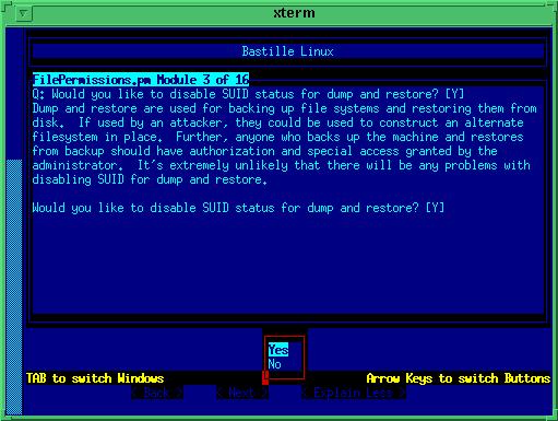 If you don't want to bother with all those questions, you can instead run AutomatedBastille.pl, which will give you the choice of several default security baselines and will then immediately harden your system accordingly. AutomatedBastille.pl is an extremely simple script; really, it's just a mechanism for invoking BackEnd.pl with a canned configuration file.