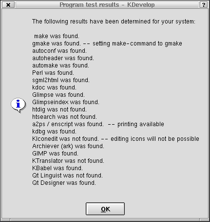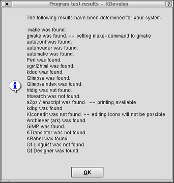 A feature of KDevelop is its ability to use many existing open-source tools. Not all of these tools are required, but they are necessary to ensure that KDevelop performs as expected. When KDevelop is started for the very first time, a list of associated tools are given and are marked as either present or missing (see Figure 1). Once this list is available, the missing tools can be installed later.