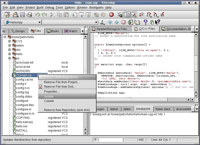 Compilation and building of the project can be done through various menu options, such as make, clean, rebuild, clean for distribution and auto configuration. KDevelop is intelligent and will prompt you, if necessary, to rebuild the project before program execution.