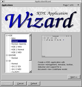 Application Type (see Figure 3)--this step allows the user to select a template for creating a program using KDE 2 Mini; KDE 2 Normal; KDE 2 MDI GNOME (Normal); Qt (Normal, Qt 2.2 SDI, Qt 2.2 MDI, QextMDI); Terminal, i.e., text (C, C++); and others (custom).