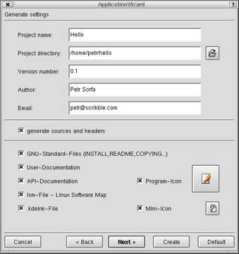 Generate Settings (see Figure 4)--this is the step to enter the project name, location, initial version number, author's name and e-mail. There are also options to generate various project-associated files, such as sources, headers, GNU standard files, icons and project-associated documentation.