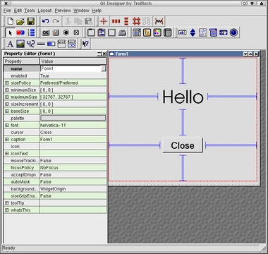 Qt Designer allows the use of layout tools and access to all widget properties. It has the ability to create relationships between widgets, such as the click on a push button with the closing of a window.