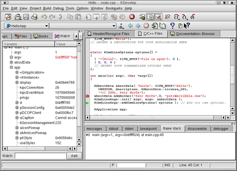 KDevelop harnesses gdb in order to provide debugging facilities (see Figure 9). Clicking in the left-hand column of the editing windows sets a breakpoint in existing code. The breakpoints can even be set when the program is not running or is in a noncompilable state, which are known as lazy breakpoints. KDevelop displays lazy breakpoints in blue and active breakpoints in red. A little green arrow next to the corresponding line of source indicates the current point of execution.