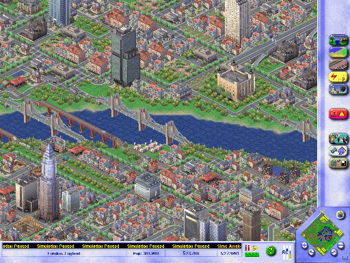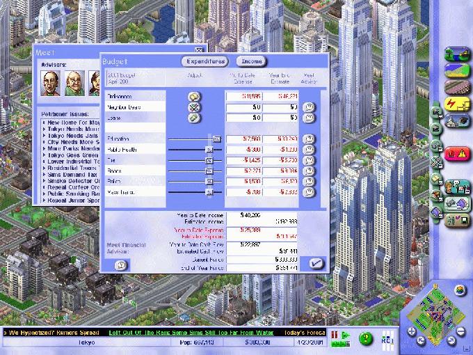 The game itself is played continuously (though it can be paused) as your city grows. You create and control everything from transportation infrastructure (subways, trains, roads, airports, seaports, etc.) to the placement of landmarks, from outfitting and maintaining the police department to managing your city's water supply and running appropriate plumbing to your neighborhoods. You're in charge of controlling pollution and dealing with the city's garbage problems. You must zone your city appropriately to attract a balance of residents with industry for them to work in and commercial businesses for them to spend their hard-earned cash in. (There are even three types of each of these zones—low, medium and dense—corresponding to the types of businesses/residences you're looking to build in a given area.) You still control taxation, but this is no longer your only source of income; you can pass ordinances that will make your city money (allowing gambling and casinos, for example) and/or generally make your city a better place. You can also make special trade agreements with nearby cities to put money in your pocket. For instance, is your water system more than adequate for your city's current needs? Why not sell some of that water to a neighbor for a while? To keep the mayor apprised with the latest information as the game progresses, you're kept up to date by a scrolling ticker along the bottom of your screen, which is actually a refreshing change from the somewhat irritating newspaper-style information windows that would occasionally pop up in earlier versions. You also have a staff of advisors who freely offer their opinions to you from time to time and who are available to consult with when you are uncertain about how to proceed.