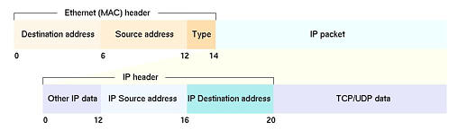 First off, we will briefly recall how a common Ethernet network card works. Those of you who are already skilled in this field may safely skip to the next paragraph. IP packets sourced from users' applications are encapsulated into Ethernet frames (this is the name given to packets when sent over an Ethernet segment), which are just bigger lower-level packets containing the original IP packet and some information needed to carry it to its destination (see Figure 1). In particular, the destination IP address is mapped to a 6-byte destination Ethernet address (often called MAC address) through a mechanism called ARP. Thus, the frame containing the packet travels from the source host to the destination host over the cable that connects them. It is likely that the frame will go through network devices such as hubs and switches, but since we assumed no LAN borders are crossed, no routers or gateways will be involved.