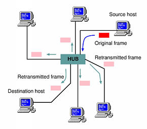 No routing process happens at the Ethernet level. In other words, the frame sent by the source host will not be headed directly toward the destination host; instead, the frame will be copied over all the cables that make up the LAN, and all the network cards will see it passing (see Figure 2). Each network card will start reading the first six bytes of the frame (which happen to contain the above-mentioned destination MAC addresses), but only one card will recognize its own address in the destination field and will pick up the frame. At this point, the frame will be taken apart by the network driver and the original IP packet will be recovered and passed up to the receiving application through the network protocol stack.