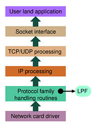 The optimal solution to this problem is to put the filter as early as possible in the packet-processing chain (it starts at the network driver level and ends at the application level, see Figure 3). The Linux kernel allows us to put a filter, called an LPF, directly inside the PF_PACKET protocol-processing routines, which are run shortly after the network card reception interrupt has been served. The filter decides which packets shall be relayed to the application and which ones should be discarded.