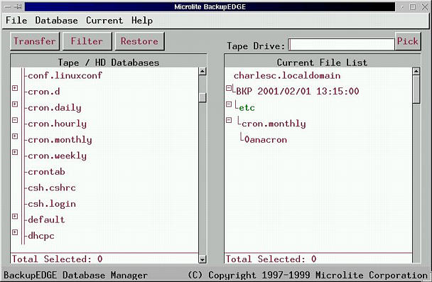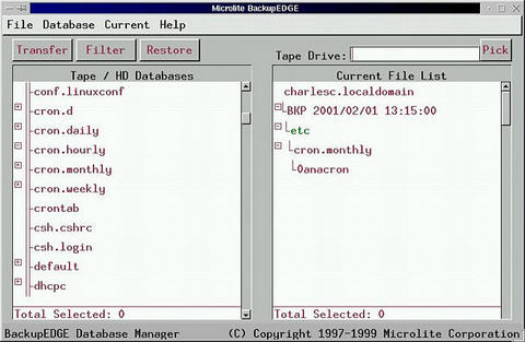 Restoration is easily done from the edgemenu program. You can restore redirected files to another location via any of the three interfaces. For the GUI addicts, there is an X-based restore tool, edge.emx (see Figure 5), that you may launch from edgemenu. It is suited for restoring individual files. Selecting a directory also selects the files and directories under it, if the directory is not expanded. The process is simple enough: select a database and click on it. Click your way down the tree until you select all the files you want. Click on Transfer to add the selected files to the restore window. Then click on Restore to restore the data.