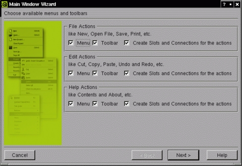 This opens the Main Window Wizard. With the first questionnaire (see Figure 2) we feel that yes, Designer should create menus and the toolbar for us. It should provide us with a code framework for the functions used and connect these functions to the relevant actions.