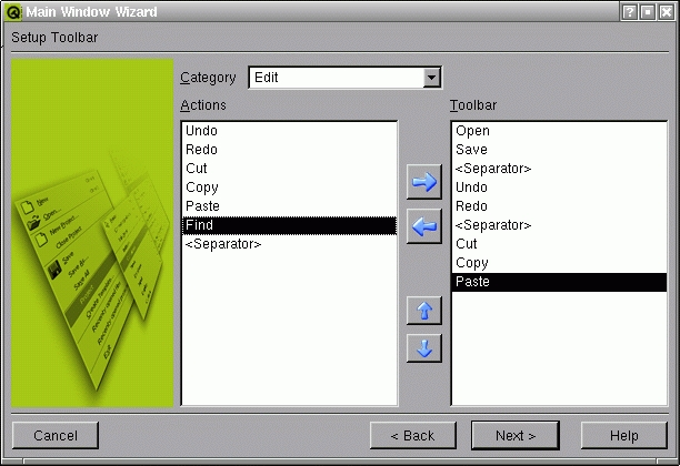 The Next> button brings us to a setup dialog for the toolbar. From the File Category, we choose Open and Save and add them to the Toolbar list using the arrow to the right. Then we choose the Edit Category and add the Undo, Redo, Cut, Copy and Paste actions, plus Separators (Figure 3). The last wizard dialog does not leave any work for us to do; it simply finishes the widget form. This leaves us with a Designer looking like Figure 4.