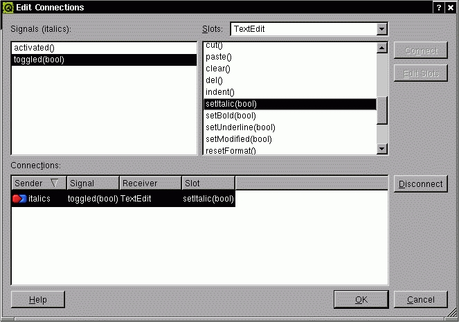 By now, these actions don't do anything when playing with the preview available by pressing Ctrl-T. To let them actually do what they promise, we once again mark the italics action in the Action Editor, click on the red-blue Edit Connections icon and choose the toggled(bool) signal from the Signals list. Instead of connecting it to an ljeditor slot, we choose TextEdit in the Slots drop-down menu and subsequently setItalic(bool) in the list of slots provided by the QTextEdit class of which TextEdit is a member. No additional click is needed; with the appearance of the connection in the Connections: window, everything is done (see Figure 6), and the OK button is our friend.