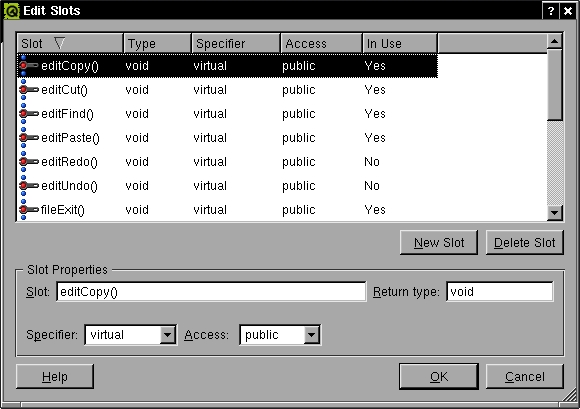 Additionally, we clean up all the ljeditor slots that we weren't going to implement anyway or that we used TextEdit slots for instead. By choosing Slots from the Edit menu (one way to do it), we open the dialog that allows us to mark editUndo() and remove it with a mouse click on Delete Slots (Figure 7). The same fate applies to editRedo(), editCut(), editCopy(), editPaste(), editFind(), helpIndex(), helpContents() and filePrint().