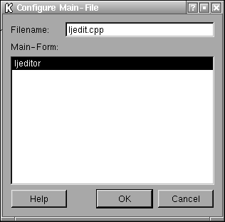 The dialog shown in Figure 1 asks us to name the main file (we choose ljedit.cpp) and the main widget. Designer does not provide the Editor subclass here; thus we don't really have a choice and choose ljeditor.