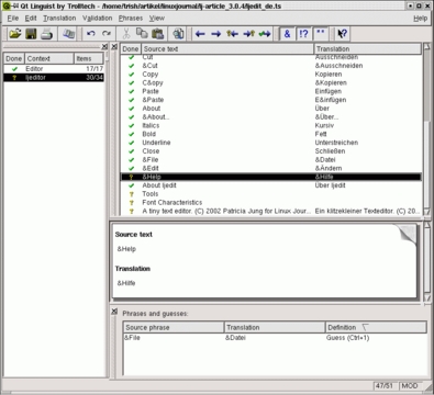 With the tr() functions around each text string, we're able to release the program in other languages. All this step requires are some modifications of the main() function and the actual translation. The latter is easily accomplished using Qt Linguist (Figure 2). But before you or another translator gets started, we have to obtain the text strings to be translated.