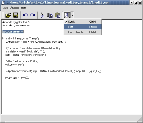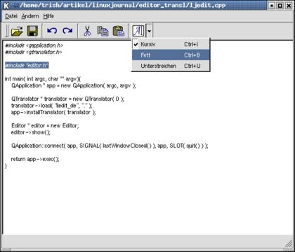 Listing 3 shows the internationalized main(). New is the inclusion of qtranslator.h and qtextcodec.h. Depending on the locale used (as defined by the environment variable LANG), the base name of the translation file is compiled (line 13). If LANG is set to, for example, de or de_DE, the application looks for a file named ljedit_de or ljedit_de.qm in /local/lib. If it can't be found there, the original language version is used. Unfortunately, there is no simple way to search multiple directories and/or avoid hard-coded directory names.