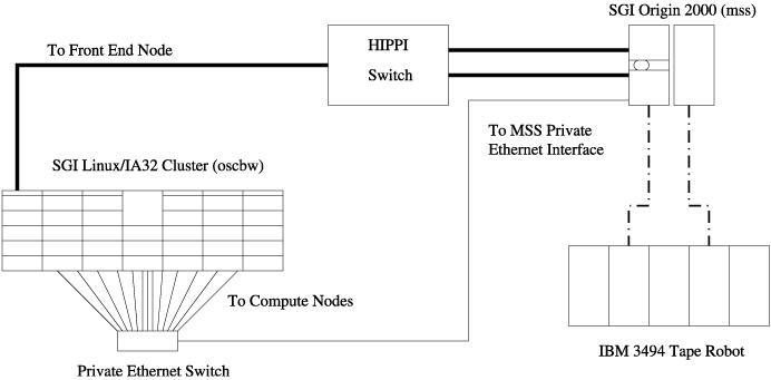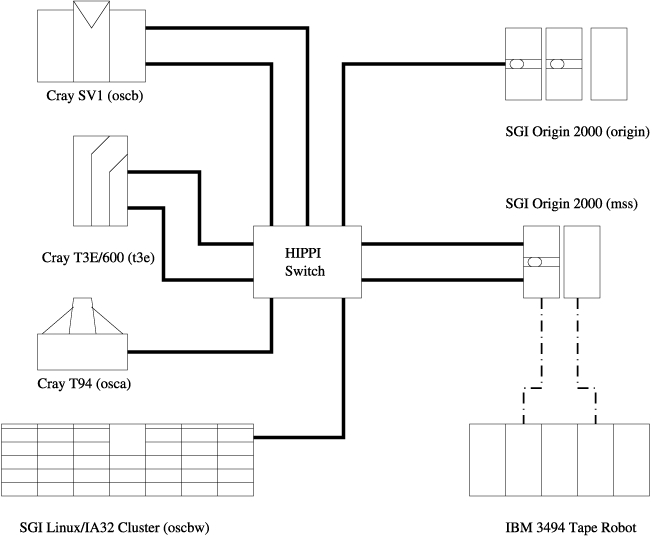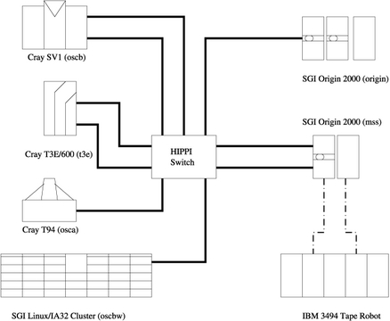 mss: an SGI Origin 2000 with eight MIPS R12000 processors at 300MHz, 4GB of memory, 1TB of Fibre Channel RAID, and approximately 60TB of tapes in an IBM 3494 tape robot with four tape drives