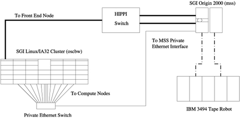 The latter four systems all mounted their user home directories from mss using NFS over a HIPPI network. When the cluster was installed, its front-end node, known as oscbw or node00, was added to the HIPPI network (see Figure 2). In addition, to make staging files into the compute nodes easier for end users, the compute nodes were configured to mount the user home directories over the private Ethernet, using a previously unused Ethernet port on mss (see Figure 3).