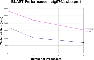 The Brain cluster was opened to friendly users in February 2000 and quickly gained a small but loyal following in the OSC user community. Somewhat to the chagrin of the OSC staff, not all of these users were interested in running parallel MPI applications. Many were interested in running older computational chemistry codes such as Amber and Gaussian 98, neither of which support MPI over Myrinet. Another rather novel application run on the cluster was a gene sequence analysis tool called NCBI BLAST, which Dr. Bo Yuan (a researcher in the Human Cancer Genomics Program at Ohio State University's college of medicine) used to annotate about sixty thousand genes from the draft version of the human genome data set in about one week's time. While not written with MPI, BLAST did run in parallel with four processors on a node by using pthreads and shared memory, and further concurrency was achieved by running multiple simultaneous jobs with each analyzing a different sequence. The pattern-matching algorithm used by BLAST is primarily integer arithmetic, and the Intel processors in the Brain cluster's nodes were found to outperform the MIPS processors in OSC's Origin 2000 systems significantly (see Figure 4).