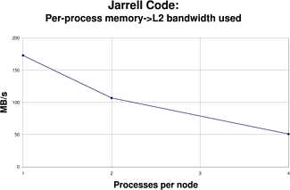 One user application that did use MPI over the Brain cluster's Myrinet network was a quantum chromodynamics (QCD) code written by Dr. Greg Kilcup from Ohio State's physics department. This code simulates the interaction of quarks in subatomic particles and is very communication-intensive, with each process sending a small message approximately every 200 floating point operations. This application is very sensitive to MPI latency and available memory bandwidth. On the Brain cluster, MPI latency was quite acceptable (on the order of 13 microseconds), and memory bandwidth became the main performance bottleneck. With four processors sharing an 800MB/s peak pipe to memory, each processor was limited to about 150MB/s sustained memory bandwidth. This limited each processor's floating point performance to about 60 MFLOPS. Using two processors per node improved both the sustained memory bandwidth and the floating point performance per processor (see Figure 5), while allowing higher processor-count runs than using only one processor per node.