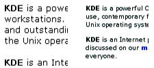 Perhaps one of the most significant advances in the latest version is anti-aliased font support. In order to enable anti-aliased fonts, KDE must be built upon QT 2.3, in combination with XFree86's Xft extension. Linux has been somewhat plagued by issues regarding true-type fonts and anti-aliasing; while these advances greatly improve that, setting up anti-aliased fonts can be a bit of a challenge. Instructions can be found at trolls.troll.no/~lars/fonts/qt-fonts-HOWTO.html. If you installed KDE via packages, it may not have been built using the necessary libraries. If this is the case, you should check for newer package versions prior to trying to configure anti-aliased fonts. Figure 3 shows an enlarged comparison view of a web page as viewed from within Konquerer with anti-aliased font support and Netscape without anti-aliased font support.