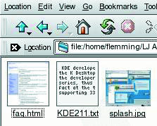 Without a doubt, the gem of the whole project is Konquerer, KDE's next-generation web browser, file manager and document viewer. Konquerer's modular architecture allows for easy extendibility to support current and emerging internet technologies, such as HTML 4.0, Java, JavaScript, XML, Cascading Style Sheets (CSS-1 and CSS-2) and SSL. In addition to built-in components, Konquerer is able to utilize existing Netscape plugins to provide support for Flash, RealAudio/Video and other multimedia programs. Taking a page from Eazel's Nautilus, Konquerer added support for text preview, a feature that creates a thumbnail of the first few lines of a text document within the icon. When used in combination with the experimental alpha blending support you are able to get a semitransparent representation of the MIME-type icon under the text. In addition to text and image preview, Konquerer is also capable of generating thumbnails of HTML documents (see Figure 4). HTML files are read and thumbnailed in the background after loading the directory view, allowing for a smooth browsing experience.