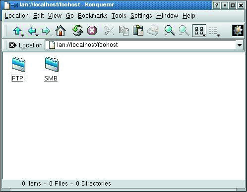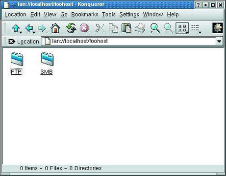 One particular IO Slave recently introduced pertains to LAN browsing. Those coming from a Windows background will most likely compare this to the Network Neighborhood. At the heart of this new feature is LISa, or the LAN information server. Unlike the Windows' Network Neighborhood, LISa only relies upon the TCP/IP stack and no other protocols such as SMB or NetBIOS. In short, once you configure LISa with information about the network to which you are attached, it will probe devices found on the network for commonly available services, such as FTP, SMB, NFS and HTTP (see Figure 5). By entering lan:/ into Konquerer, you will be presented with a list of all discovered servers and their associated services. While it may sound like LISa would create a lot of unnecessary network traffic, that is not the case. In fact, the more clients you have on your network running LISa, the more efficient it should become. LISa itself is a dæmon that runs on the client. Upon startup, that dæmon sends out a broadcast in an attempt to discover already existing LISa servers on the network. In the event that one is found, the network servers list is transferred to the new client without unnecessary network probing. At any given point in time, there should be only a single LISa node on the network doing the actual probing. LISa needs to be run as root and can be configured via the Network/LAN browsing control center module. LISa is a component of the kdenetwork package.
