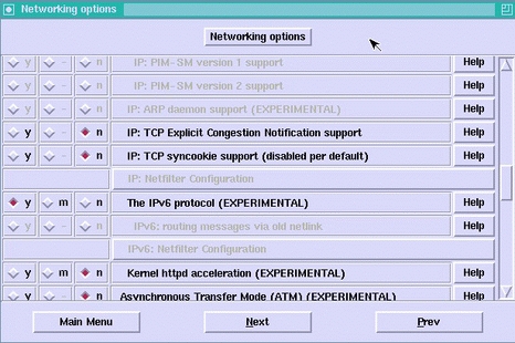 ln -s /usr/src/linux-2.4.5 /usr/src/linuxHaving done that, you need to configure the new kernel to enable support for IPv6: