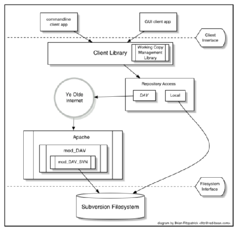 Advanced network layer: the Subversion network server is Apache, and client and server speak WebDAV(2) to each other. (See the “Subversion Design” section below.)