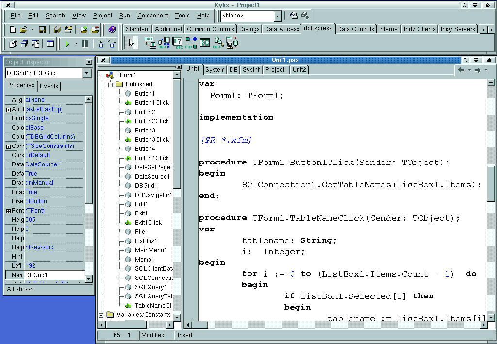 The initial version of Kylix supports the Object Pascal programming language, which is a merger of Pascal, Modula 2 and object-oriented concepts. The language is probably easier to learn for absolute programming beginners as it is closer to the English language, very much like a scripting language. My major gripe was getting used to the := symbols for assigning variable values. While programming, I appreciated the Kylix editor that helps you to program and use the components.