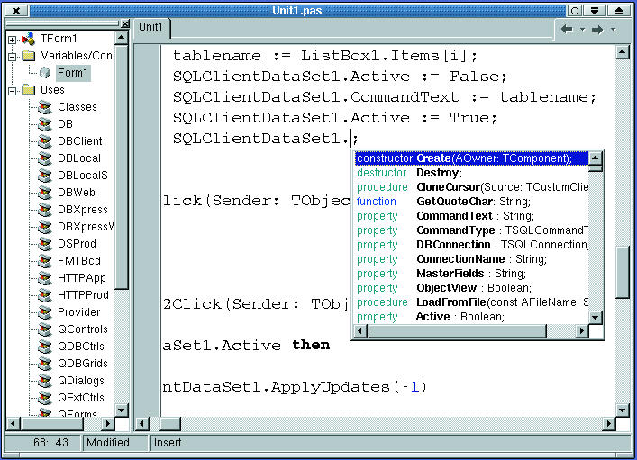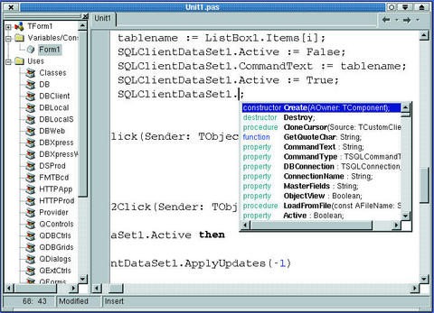 The Kylix editor is definitely one of the most capable editors I have ever seen for Linux. Apart from color highlighting program sections while you type, it attempts to predetermine what you are typing (including programming constructs) and assists you with function parameters and class elements (see Figure 2). This feature also analyzes a class declaration and automatically creates functions with default content. Emacs fans can rejoice, as the editor can be set to handle Emacs key mappings.