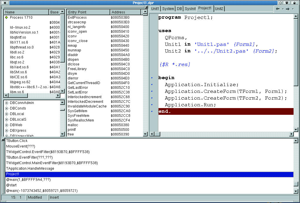 Debugging is the standard useful fare. It is a good implementation but nothing extraordinary (like changing the code while debugging and carrying on execution without restarting the program). I was extremely pleased to discover that GDB supports the Kylix-generated binaries. Unfortunately, I could only use GDB to debug at machine code level as the symbol table failed to load. I either was using an incorrect version of GDB or did not have a correct compilation flag set. The Kylix debugger and GDB provide a win-win situation for beginner and advanced users alike (see Figure 3).