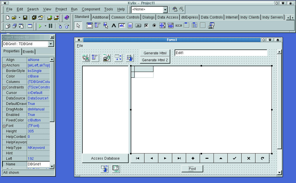The Kylix GUI builder is a good commercial front-end builder (see Figure 4). Kylix extends what is usually expected from GUI builders (as RAD components), such as database connectivity and web server tools (which have nothing really to do with the GUI), by actually representing them via the GUI. This use of nonvisual RAD programming components in the GUI allows for easy access to associated GUI front ends.